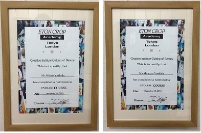 | 東京・ロンドン イートンクロップアカデミー北川忠夫上級者エンドレスコースディプロマ証明書。現在もヘアーカットマスターアカデミー、ヘアーカットノラアカデミーに継続参加しています。 |